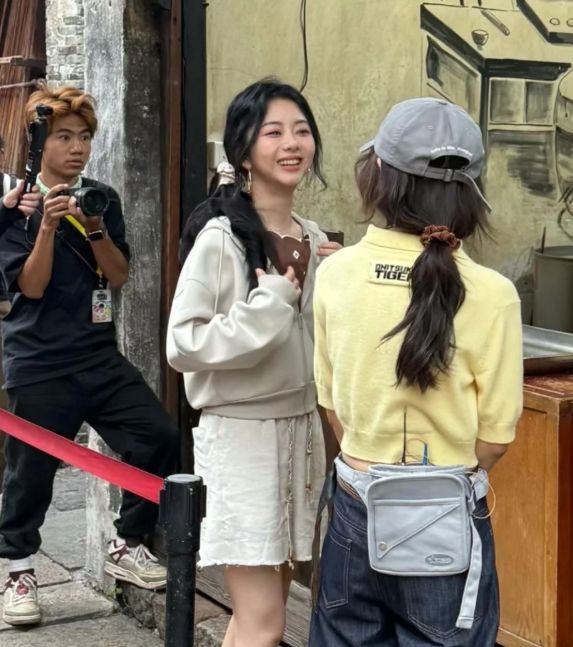 与谭松韵形成鲜明对比的是,张子枫的穿着则简单到了极致。一件普通的 T 恤搭配一条经典的牛仔裤,这几乎成为了她日常穿搭的标配,完美契合了她一贯低调的穿衣风格。在娱乐圈中,许多明星为了在综艺节目中吸引眼球,常常会在穿搭上花费大量心思,力求通过独特的造型来博取热点。张子枫却反其道而行之,她始终坚守着自己的低调原则,作为节目中的常驻嘉宾,她从不刻意争抢飞行嘉宾的风头,默默地在节目中展现着自己真实的一面。从她的背影照来看,她身形消瘦,微微有些驼背,这或许与她平时的生活习惯有关。而此时,对面的谭松韵正对着她露出甜美的笑容,那笑容仿佛能驱散一切阴霾,让人感受到了她们之间深厚的情谊。