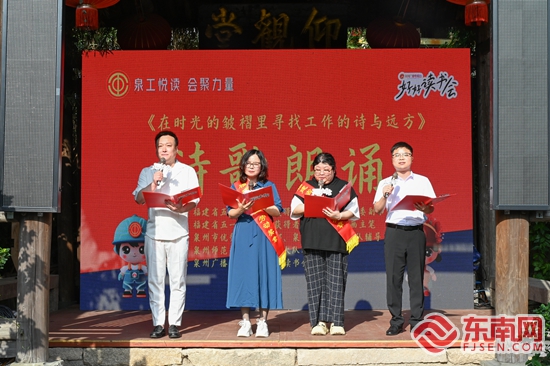 此次活动特别加入了朗诵环节,“泉工悦读”领读人与劳模工匠们共同登台,以富有感染力的声音朗诵《在时光的褶皱里,寻找工作的诗与远方》,带领现场职工们在忙碌工作中寻找生活的诗意,传递出扎根当下、拥抱幸福的温暖力量。朗诵声刚落,泉州市工人文化宫南音社的艺术家们怀抱琵琶、三弦,轻启檀板,一曲悠扬的南音婉转流淌,劳动的诗意与世遗的雅音交织,让闽南文化根脉在书香中焕发新生。
