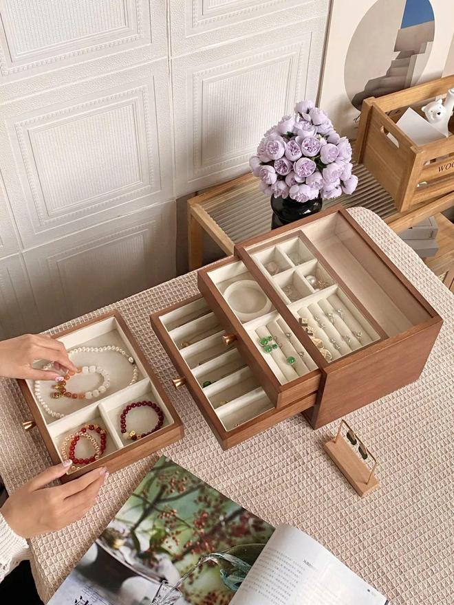 「实木三层首饰收纳盒」拒绝饰品打结弄丢,3层大容量超能装,合理分区,随取随用。第一层顶层高透玻璃,一目了然,你可以用它来放耳环耳钉戒指;第二层可以用它来放一些珠宝手镯手链;第三层可以用它来放项链发簪手表等。