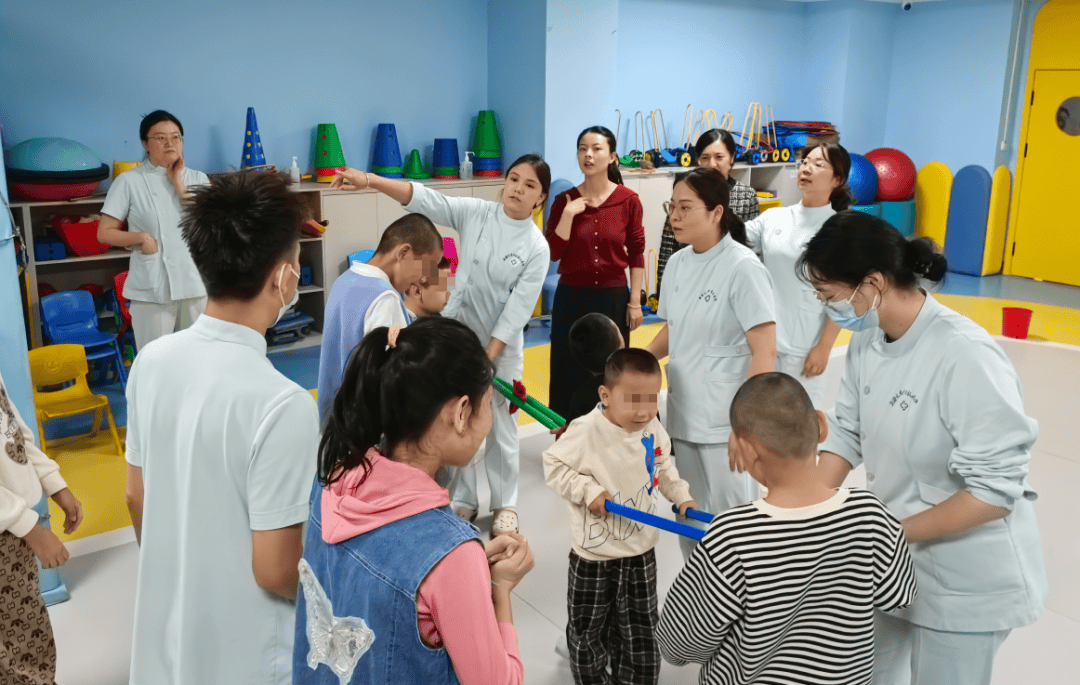 “齐头并进 ”趣味游戏现场,两名儿童患者默契组队、相互配合,共同手持棍棒将沙包稳稳夹在两棒之间,缓慢移动将沙包从起点移至终点框内,通过游戏以达到帮助患者提升身体协调能力与团队协作意识的目的,让康复训练充满趣味性与成就感。